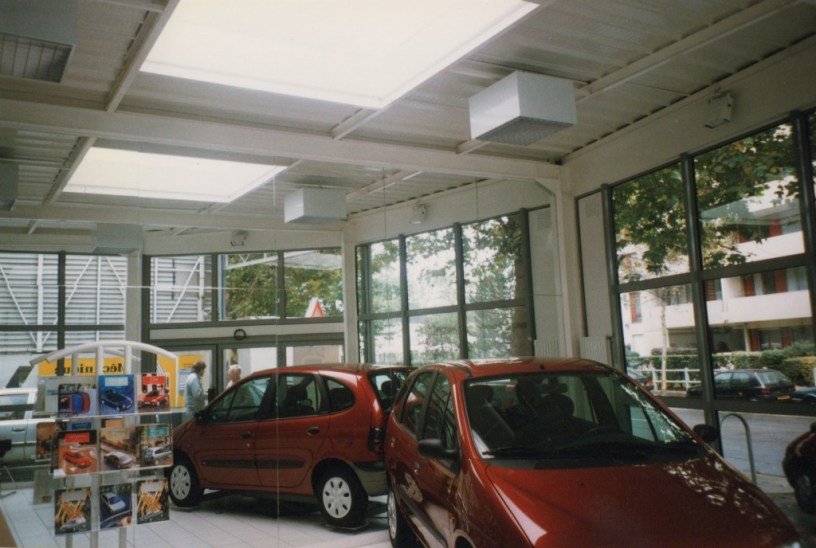 Le mur mitoyen a été traité en miroir, la voiture exposée se réflechit et l’effet est garanti. L’ensemble parait grand et est très lumineux.