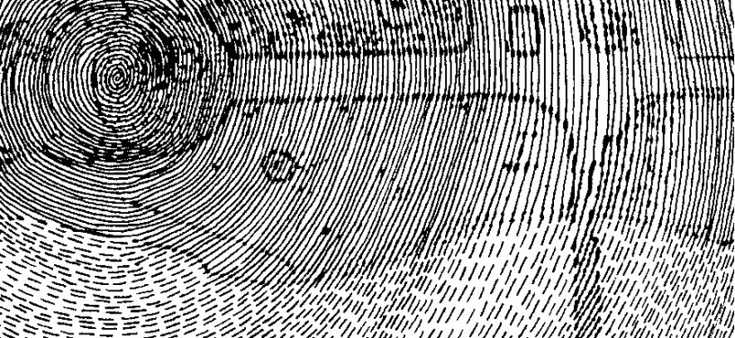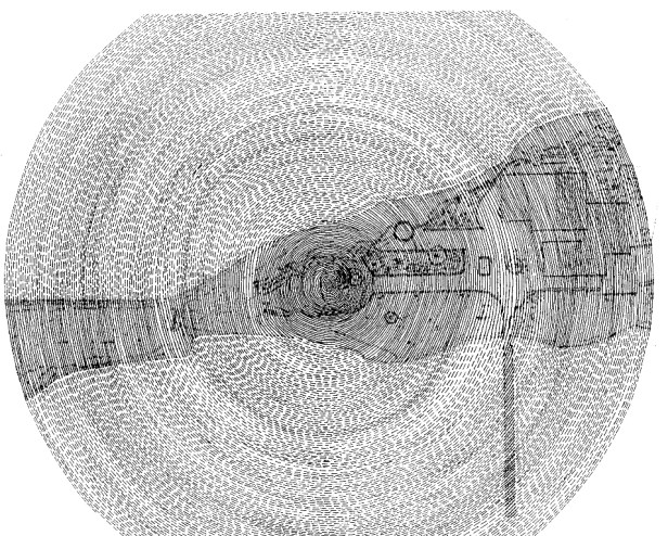 Prendre son rotring, le placer au centre de gravité de la vue aérienne de l’Ilet, là, exactement où se trouve le chaudron, sur la terrasse de lave noire, et commencer la spirale d’encre tranquillement, régulièrement en prenant soin d’épaissir le trait par un léger ralentissement du mouvement du rotring, où se trouvent les bordures, les grosses pierres, les plantes, les fleurs, les murs et puis pointiller, pointiller, pointiller lorsque l’on survole la mer du lagon. Se reposer et reprendre le soir ou le lendemain, le même mouvement circulaire pour laisser apparaître de plus en plus de traces, encore et encore.