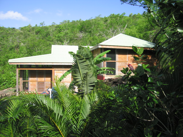 La maison ne comporte que deux chambres et ses volumes minimalistes respectent la proximité de la zone naturelle du Morne Champagne. La composition en plusieurs volumes permet de s’adapter au mieux au dénivelé du terrain.