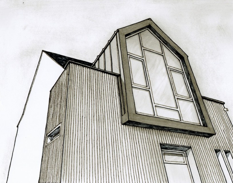 La lucarne est comme une maison dans la maison, beaucoup de force dans ces plans de niveau rectangulaires qui se propulsent vers la rue, le jardin et la lumière.