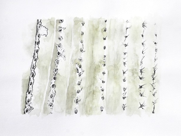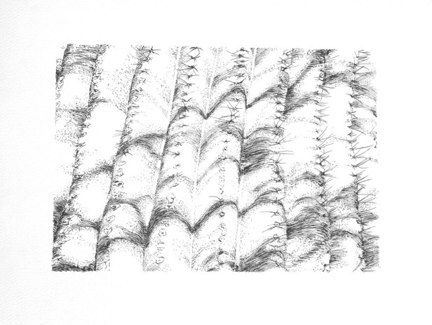 Je réalise des séries, plusieurs toiles ou dessins regroupant les différentes intensités du voyage. J’aime à représenter l’épiderme des choses, membrane souple et communicante entre l’intérieur et l’extérieur. Mes compositions sont très structurées comme s’il s’agissait de définir une construction architecturale.